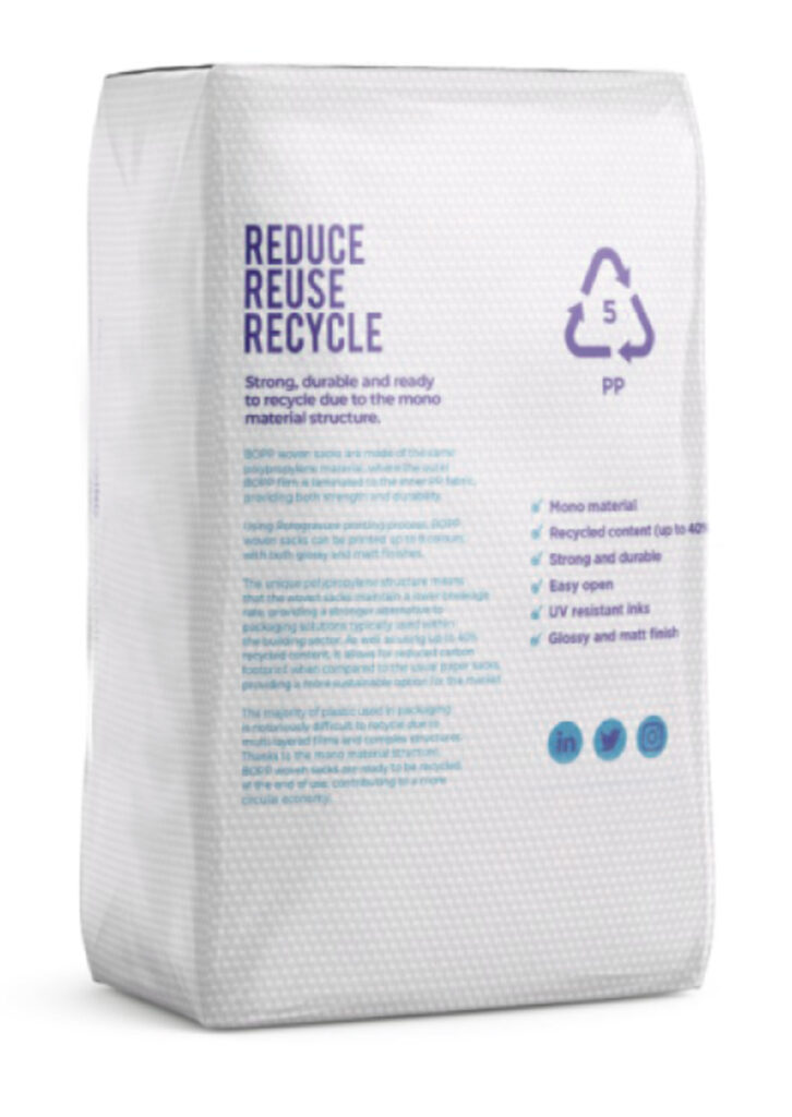 مصنوعة من مادة البولي بروبيلين المنسوجة المتينة، وتتميز بقاعدة مستطيلة مزودة بصمام ذاتي الإغلاق. يضمن هذا التصميم سهولة التعبئة والإغلاق والتكديس.